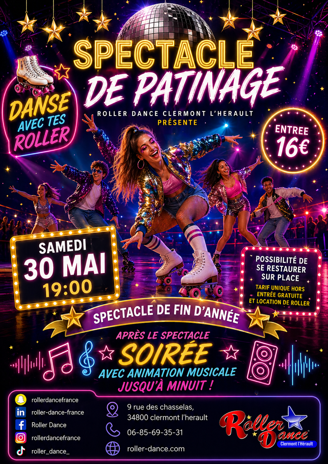 Plongez dans un univers mêlant danse et roller, où les patineurs vous proposent des chorégraphies dynamiques et artistiques. Ce spectacle met en lumière le travail réalisé tout au long de l’année dans une ambiance festive et conviviale.